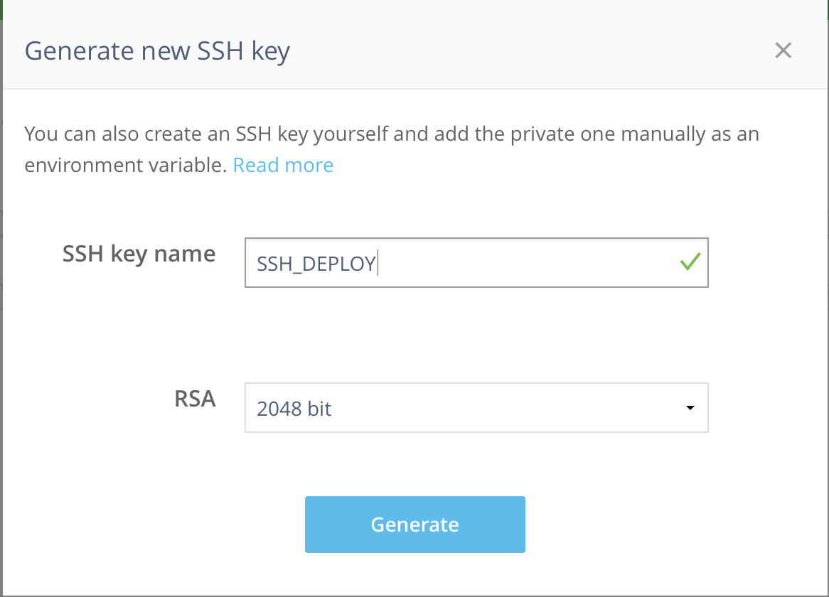 As SSH Key name use SSH_DEPLOY (the same name we used in yml file), and click Generate.