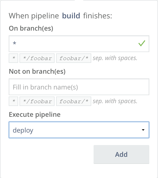 The only thing you should change now is Execute pipeline – click on the field, select deploy and confirm by clicking Add.